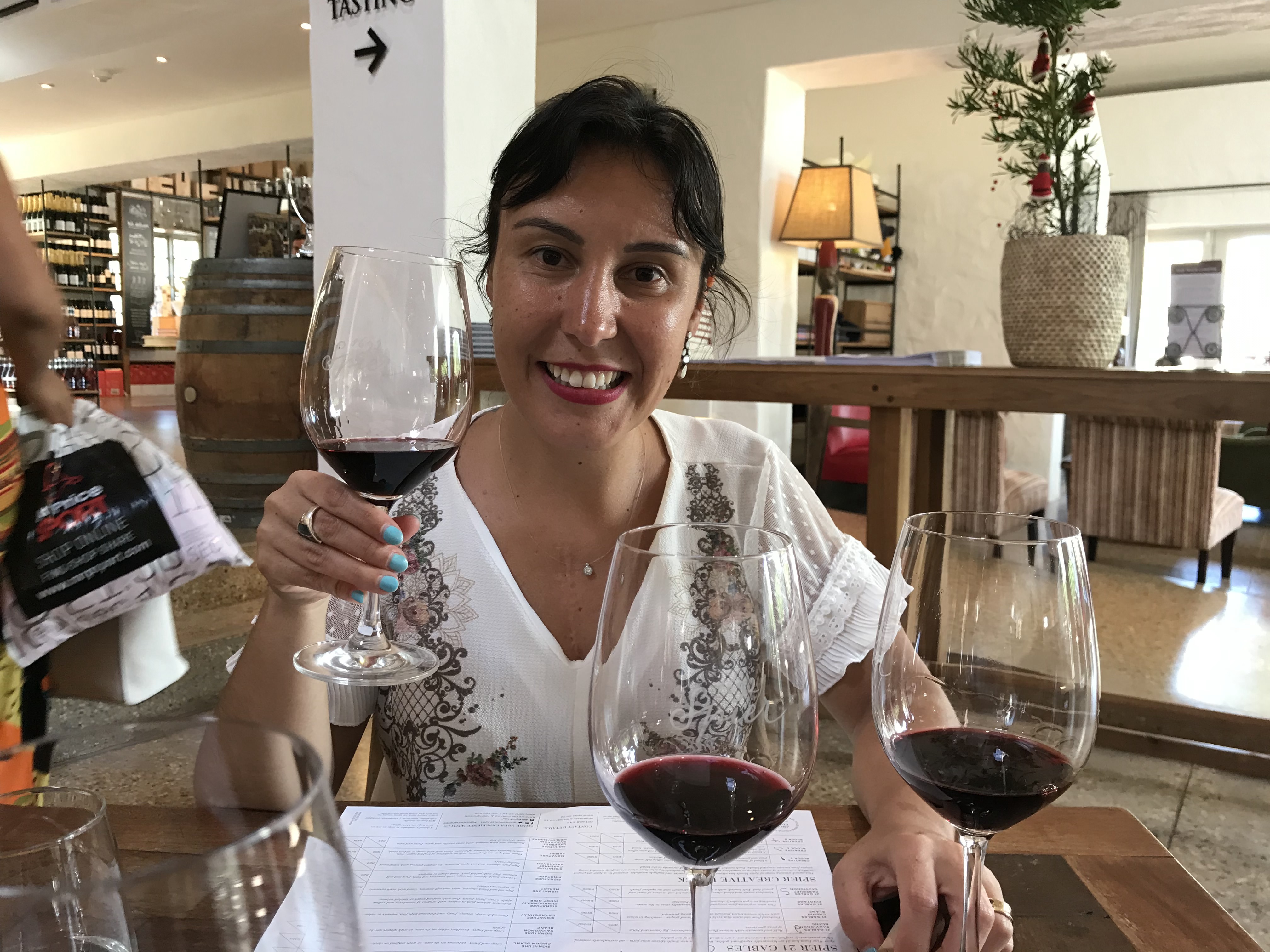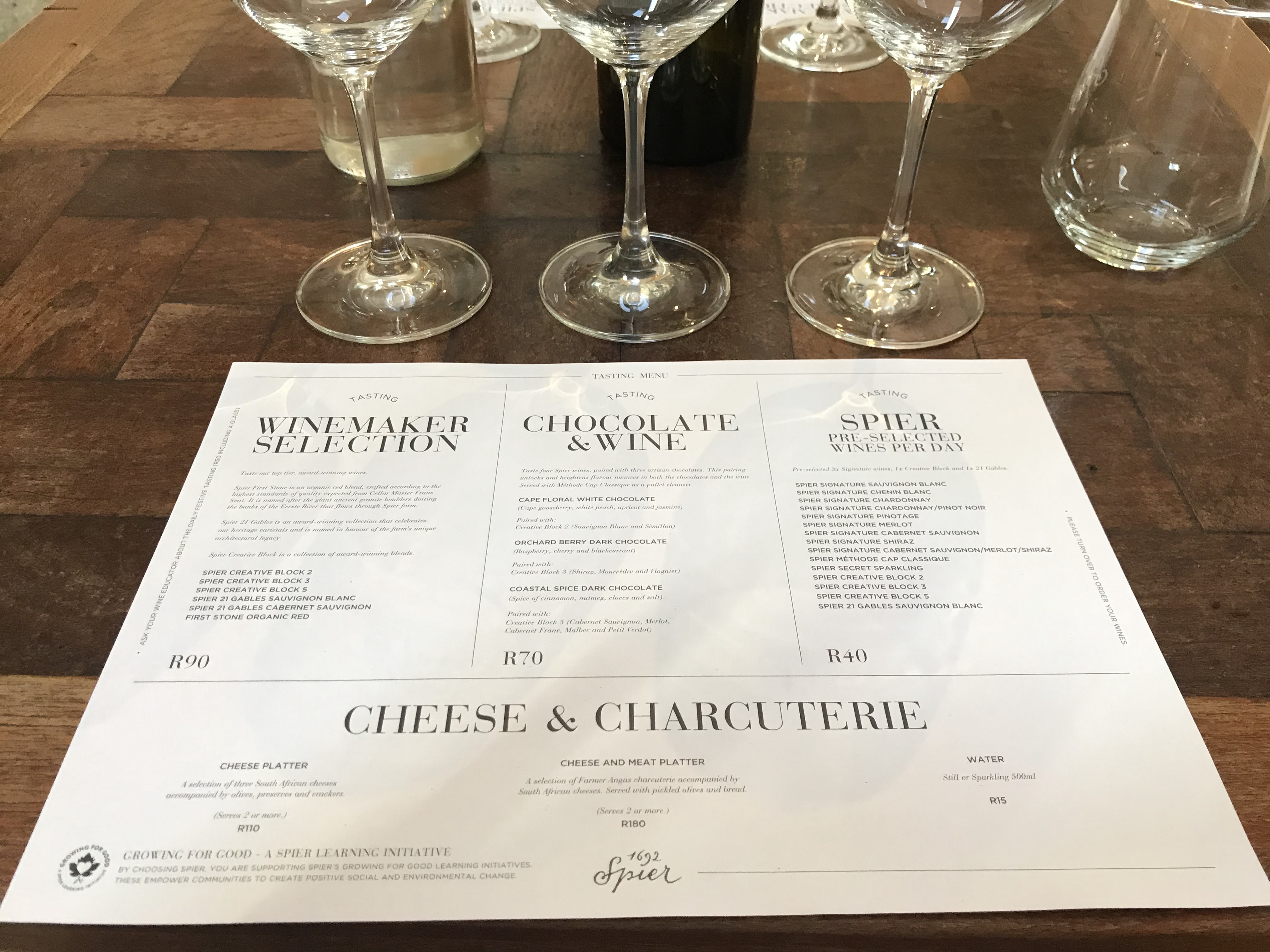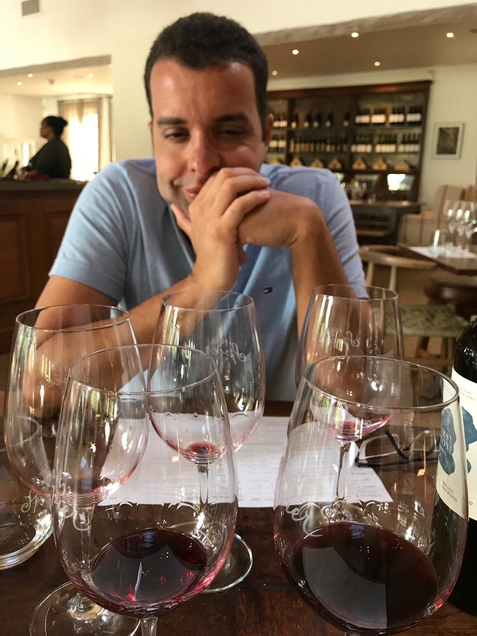 A prova dos vinhos, para gente, foi por em prática o que havíamos estudado em livros. Eles contam com uma carta riquíssima e premiada que, ao experimentar, vai te levando a percepções olfativas, visuais e experimentais impressionantes. Eu realmente recomendo essa vivência aos nossos viajantes apaixonados por vinho a um preço que consideramos justo, 90 rands, cerca de R$ 25,00 por pessoa. E você vai aproveitar várias safras, cada uma mais diferente que a outra.