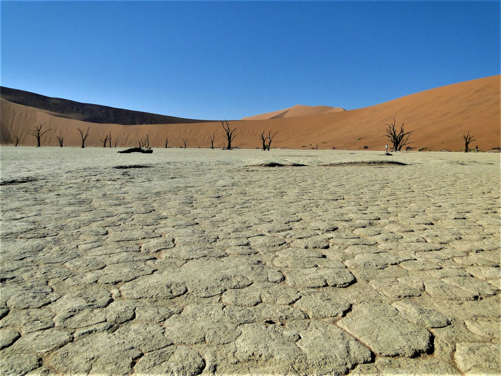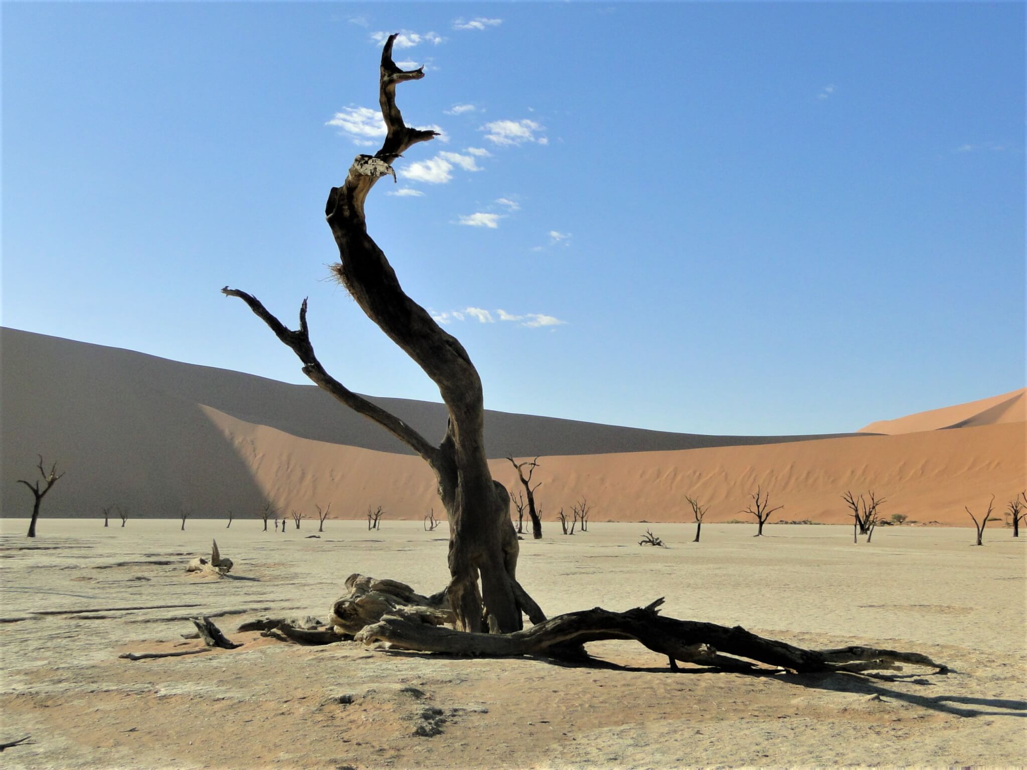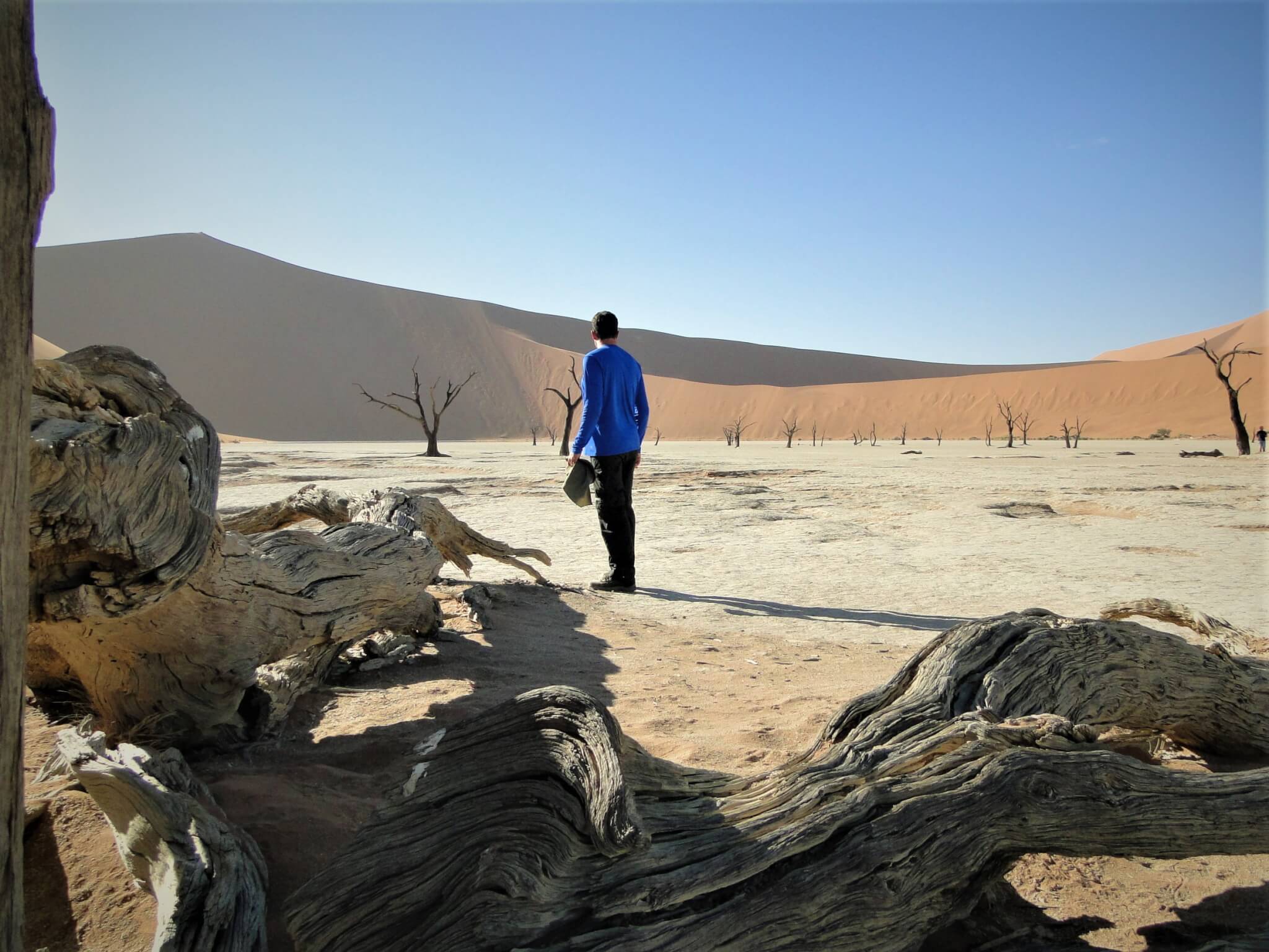 Chegamos cedo ao Parque Nacional de Sossusvlei e aproveitamos a dica do guia: caminhar no contra-fluxo de pessoas que iriam visitar as atrações do lugar. Escolhemos então começar por este que, para mim, é o lugar mais mágico e enigmático. As árvores centenárias morreram, mas permanecem retorcidas, várias delas em um vale, o Vale da Morte. Enquanto os turistas caminharam até a Duna 45 (que fica mais perto da entrada do parque) nós fomos até o Deadvlei, que estava vazio no momento em que chegamos e deu para registrar fotografias incríveis.
