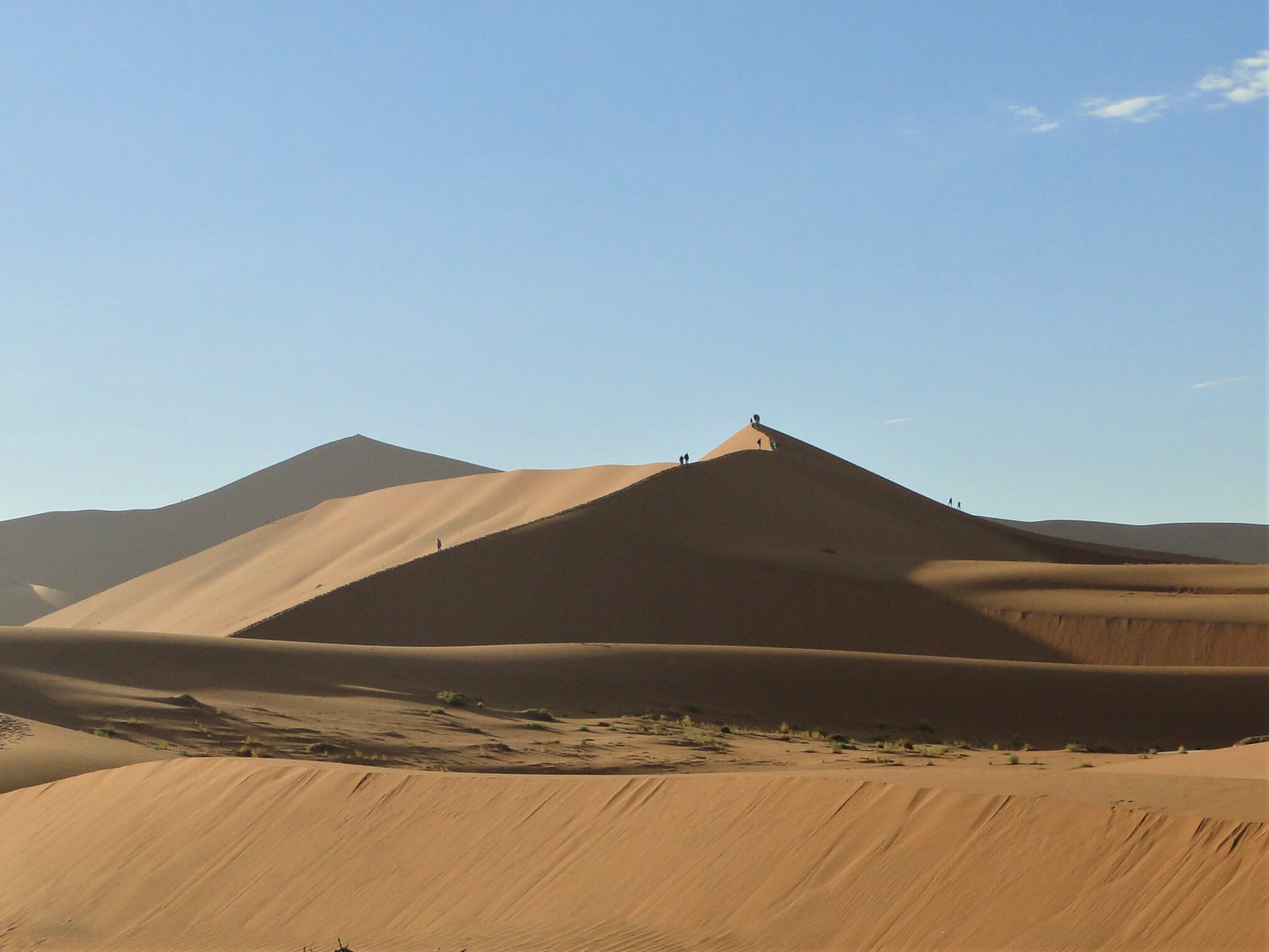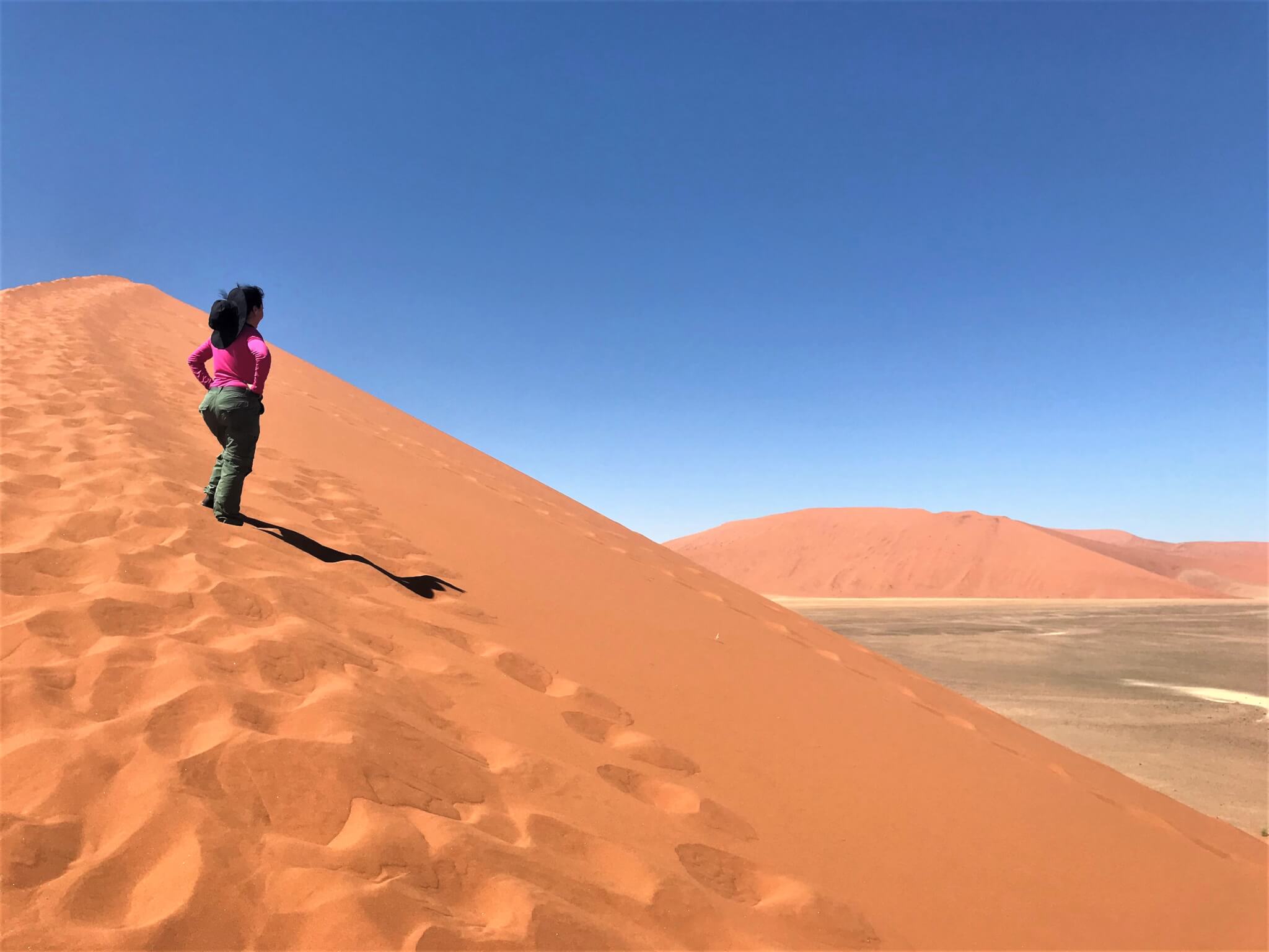 Muitos viajantes, como nós, arriscam subir até o cume. A visão de cima é linda e as fotos ficam espetaculares. É um pouco trabalhoso, já que a areia é bem fofa e o calor colabora pra ficar ainda mais porosa. Um pouco de força de vontade misturada com bastante hidratação, nos fez ter força para subir. E o espetáculo lá de cima é impagável.